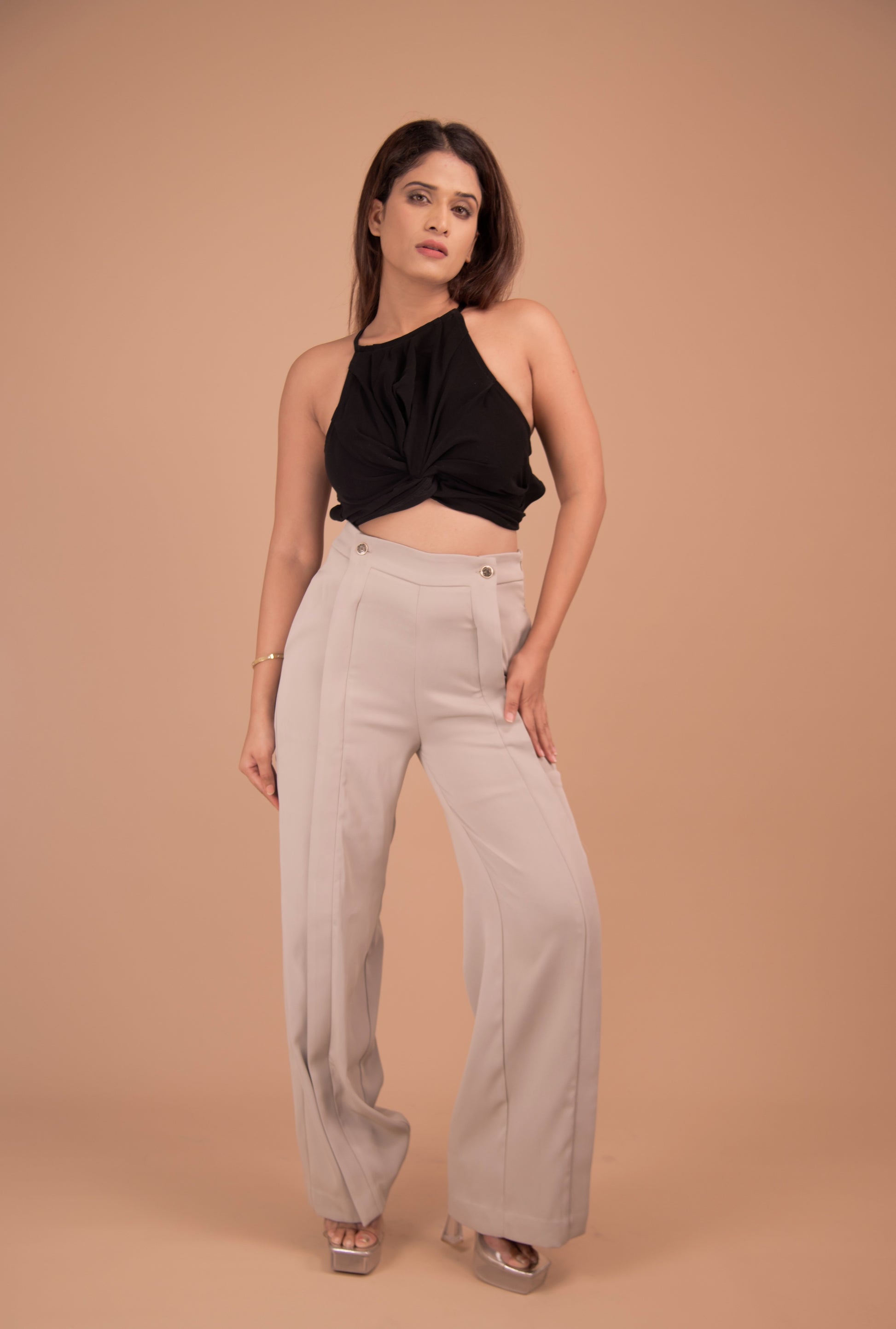 A sculpted co-ord pairing precision-cut, high-waist trousers with a sculptural cropped top. Expert tailoring and a premium stretch-blend fabric create a sleek, hourglass silhouette — refined, modern and utterly wearable.
