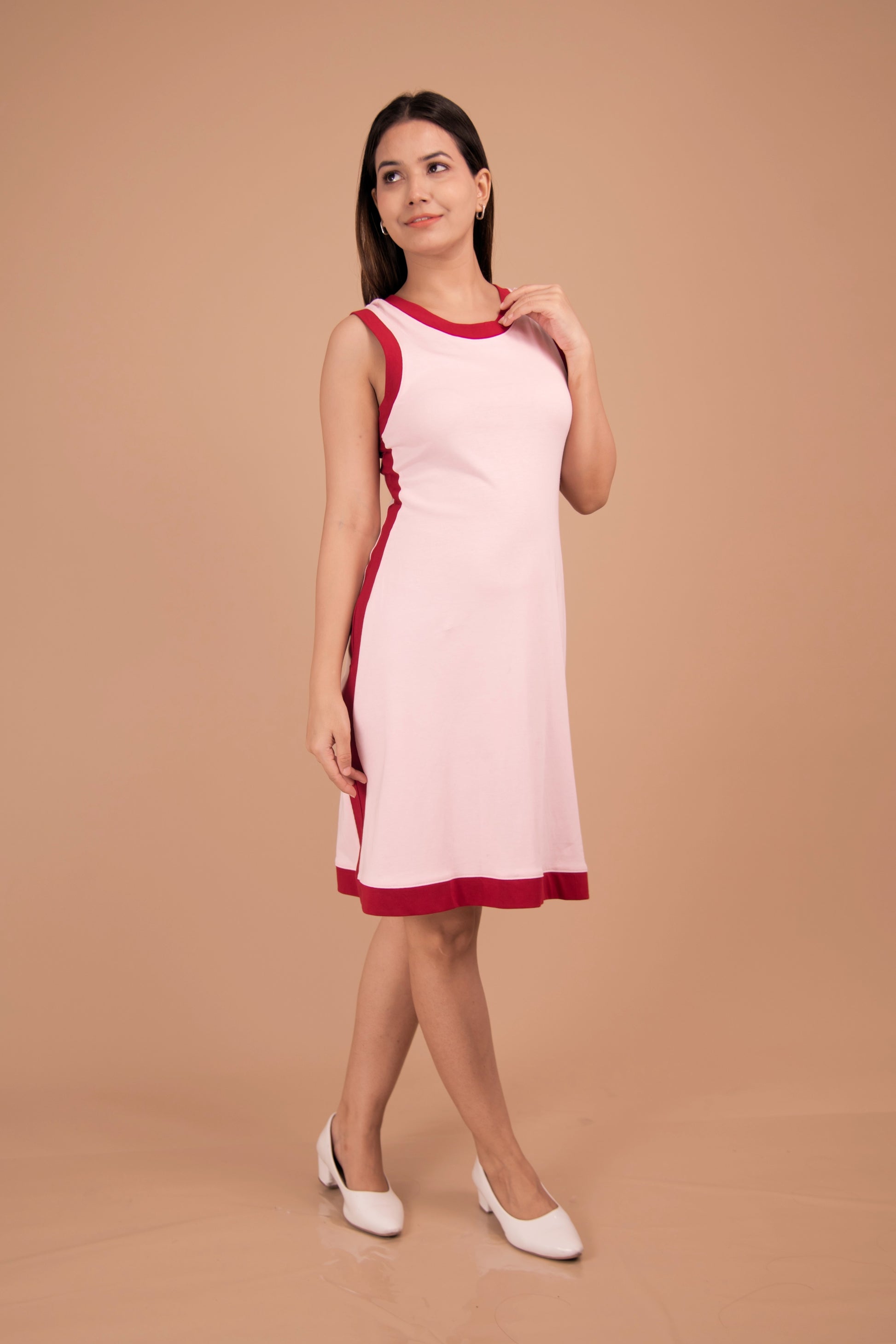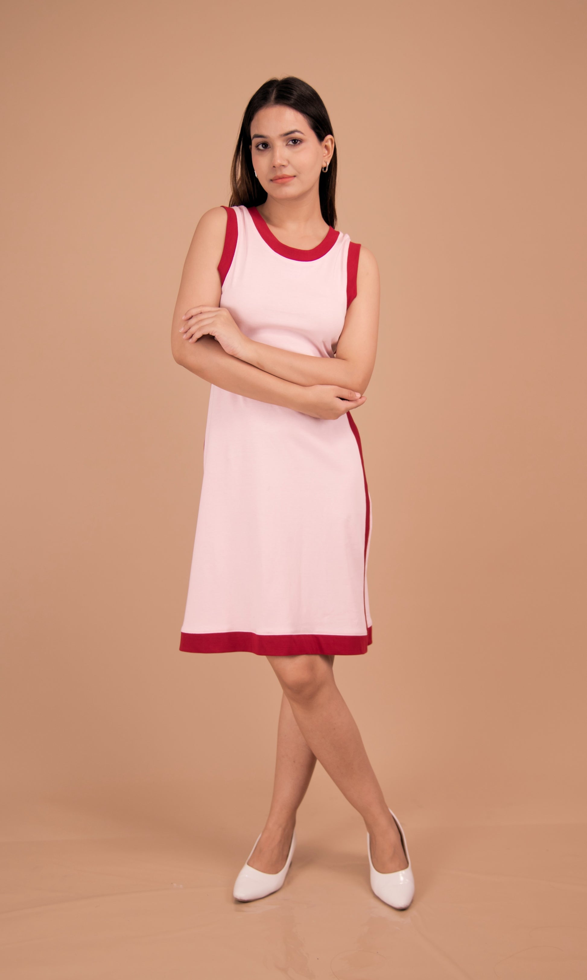 Crafted from premium cotton-jersey, this pared-back shift dress combines breathable comfort with modern tailoring. The sculpted square neckline and sleeveless cut are framed in striking ruby contrast trim that defines the silhouette while adding a sporty-luxe note. Cut to skim gently through the body with a slight A-line for movement, it’s fully lined at the bodice for structure and finished with neat topstitching for a polished look.
