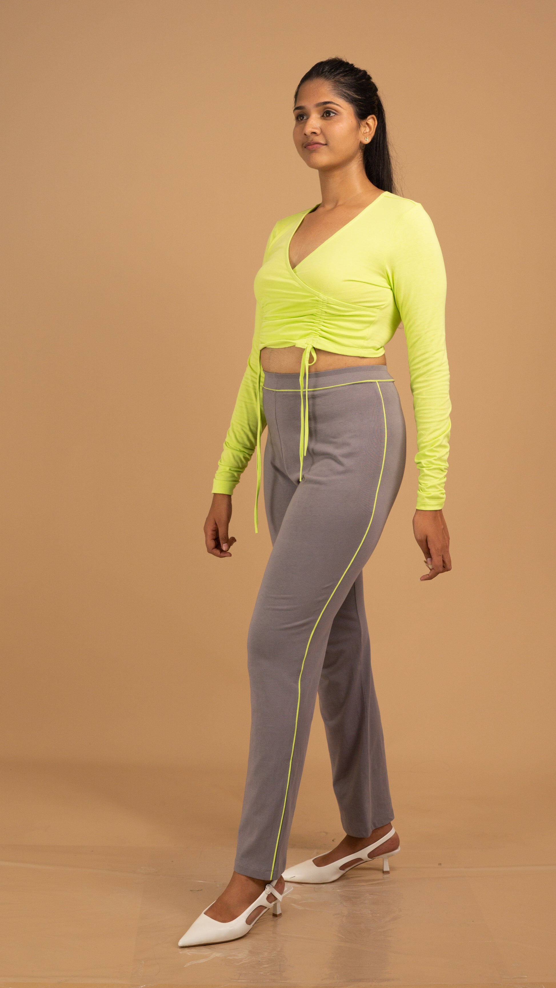 The Citrus Glow & Slate Ease Co-ord Set is a statement in vibrant minimalism. Crafted from premium cotton for unmatched comfort, the neon lime ruched crop top adds an energetic burst of color with adjustable drawstrings for a flattering fit. Paired with sleek slate-grey straight-leg trousers, this set blends relaxed ease with modern elegance—perfect for upscale casual wear that turns heads effortlessly.