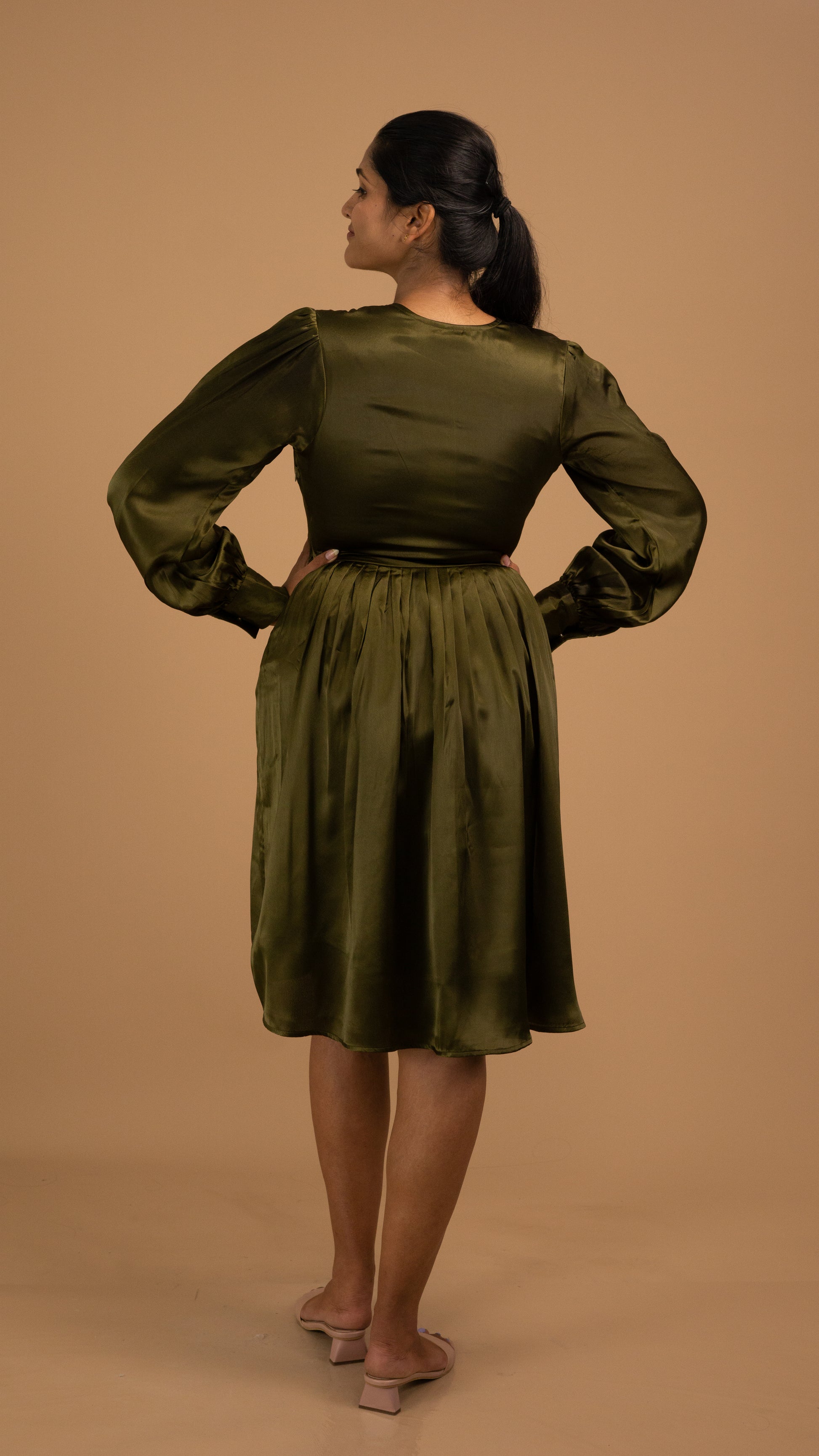 The Emerald Whisper Satin Wrap Dress embodies effortless sophistication. Crafted from sumptuous satin in a rich olive green hue, it features a graceful wrap silhouette, cinched waist, and softly gathered skirt for fluid movement. The long, subtly puffed sleeves with buttoned cuffs add a refined touch, making this piece a timeless choice for elegant dinners, art soirées, or any occasion that calls for quiet luxury.
