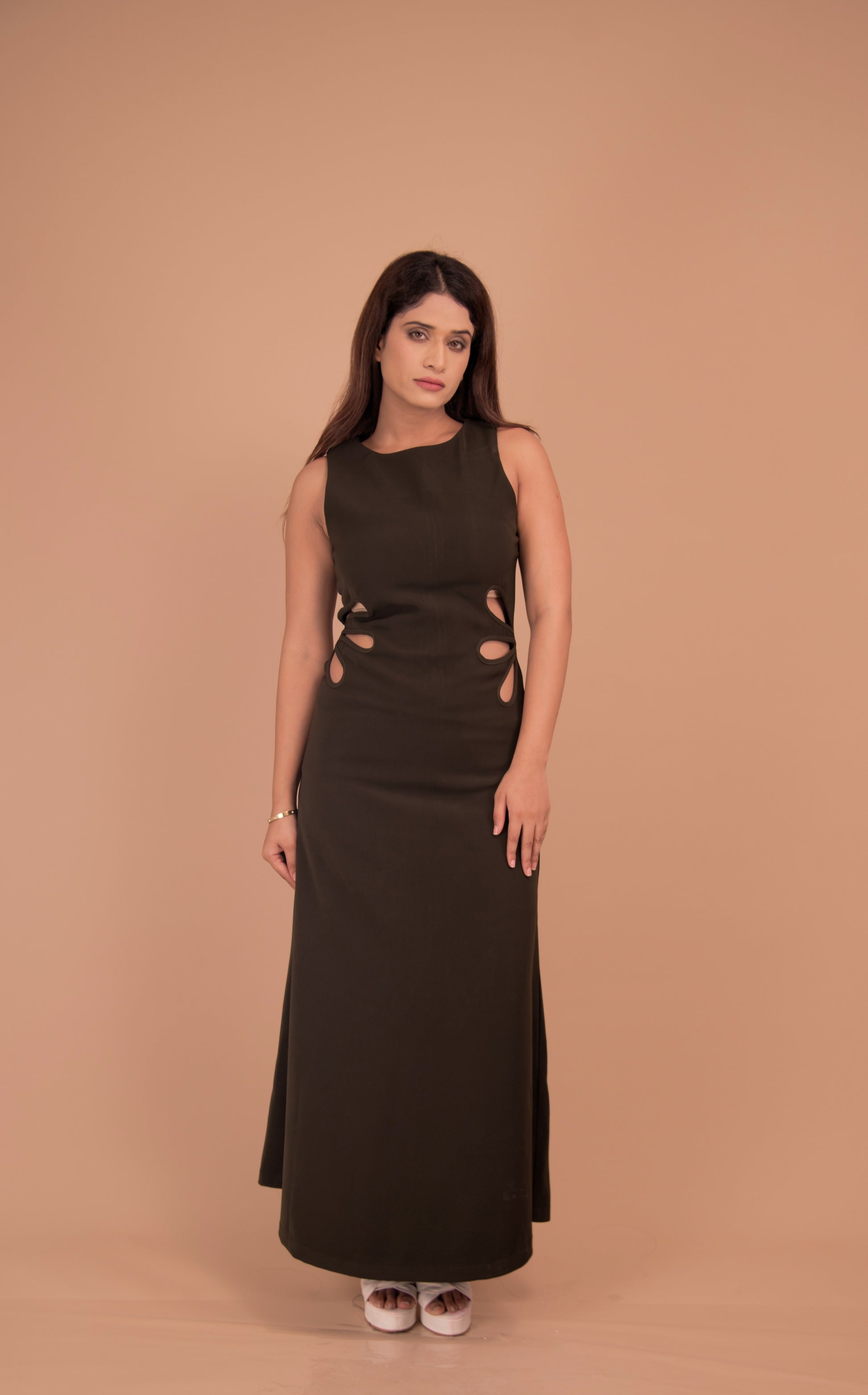 Where minimalism meets bold detailing — the Olive Cut-Out Maxi Dress is a statement in modern elegance. Crafted from a premium, soft-touch fabric, this floor-length silhouette skims the body with effortless grace. The sleek boat neckline frames the face, while the strategically placed side cut-outs, shaped in fluid teardrop forms, add an alluring architectural edge. Designed for evening soirées, luxury getaways, or high-fashion events, this dress embodies understated glamour with a daring twist.