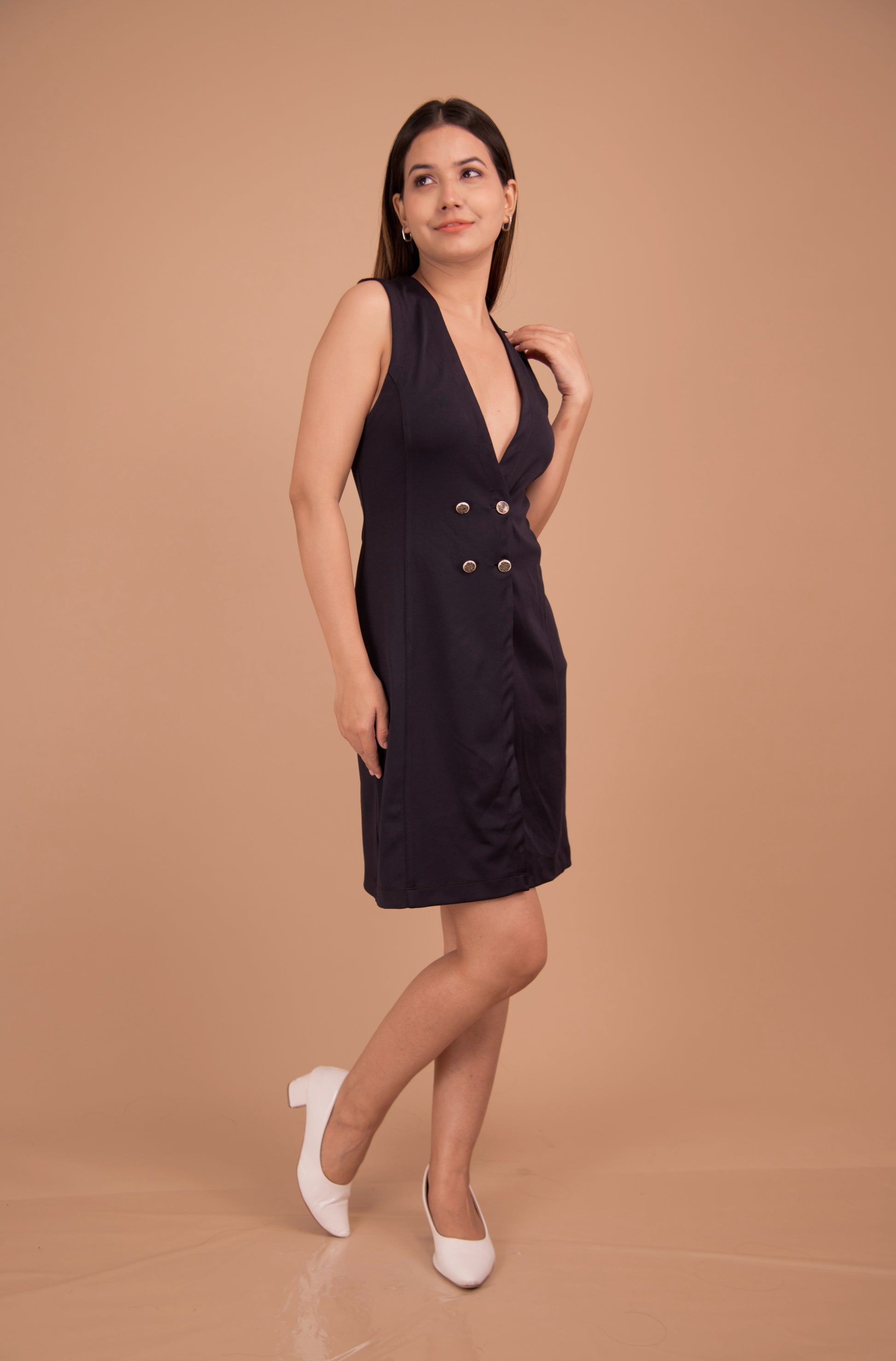 An exercise in modern tailoring, The Astor transforms classic suiting into a refined evening silhouette. Cut from a luxuriously soft cotton-blend with a whisper of stretch, its clean lines and structured bodice skim the figure while ensuring breathable comfort. A deep V neckline and double-breasted front give confident, architectural appeal, while invisible seaming and a tailored hem keep the look impeccably refined.